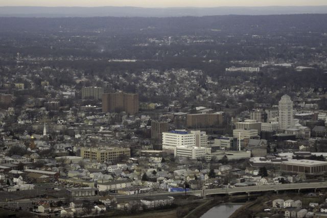 The photo also shows a nice view of central Elizabeth and the Elizabeth River in the foreground. There is a beautiful band of the Watchung mountains in the background. There are also 3 or 4 other water towers visible in the photo.